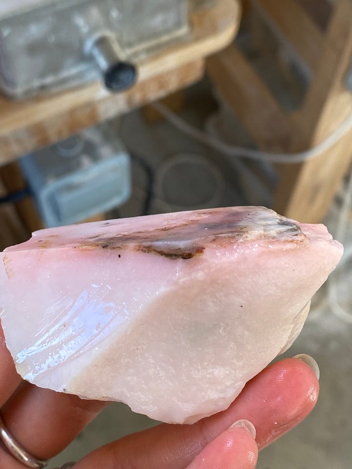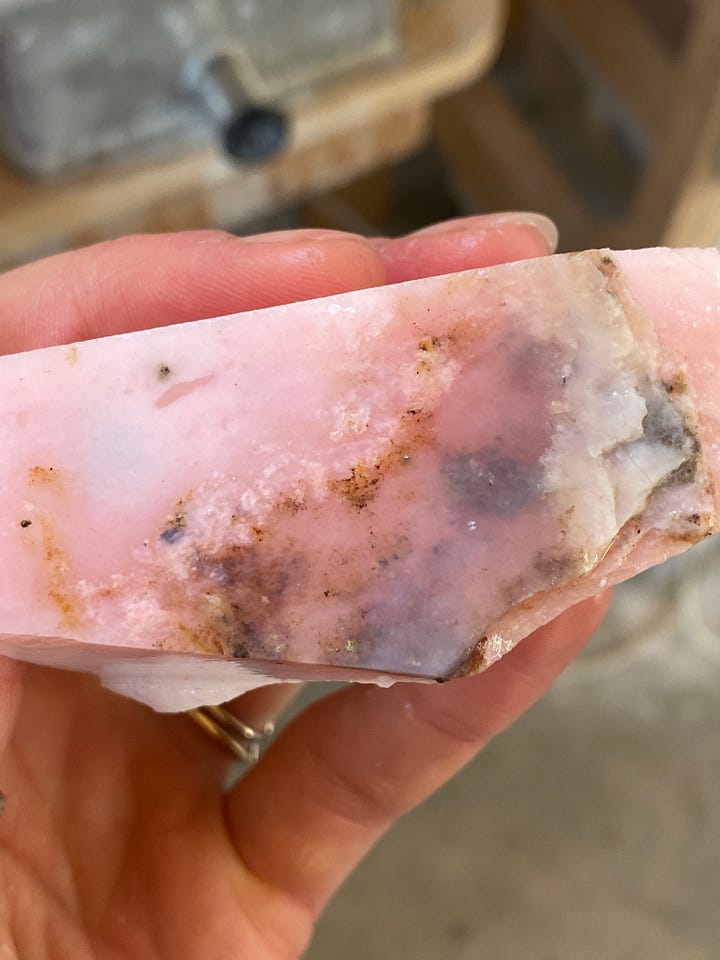 Given free reign to make our choice of rock from a table laden with them, I was immediately drawn to the opaque pink opal and upon turning it over, marvelled at how the Oil of Olay hue gave way to gritty browns and flaked white around its outer edges, looking like the salty burnt grit caught in congealed fat scraped out of a roasting pan.